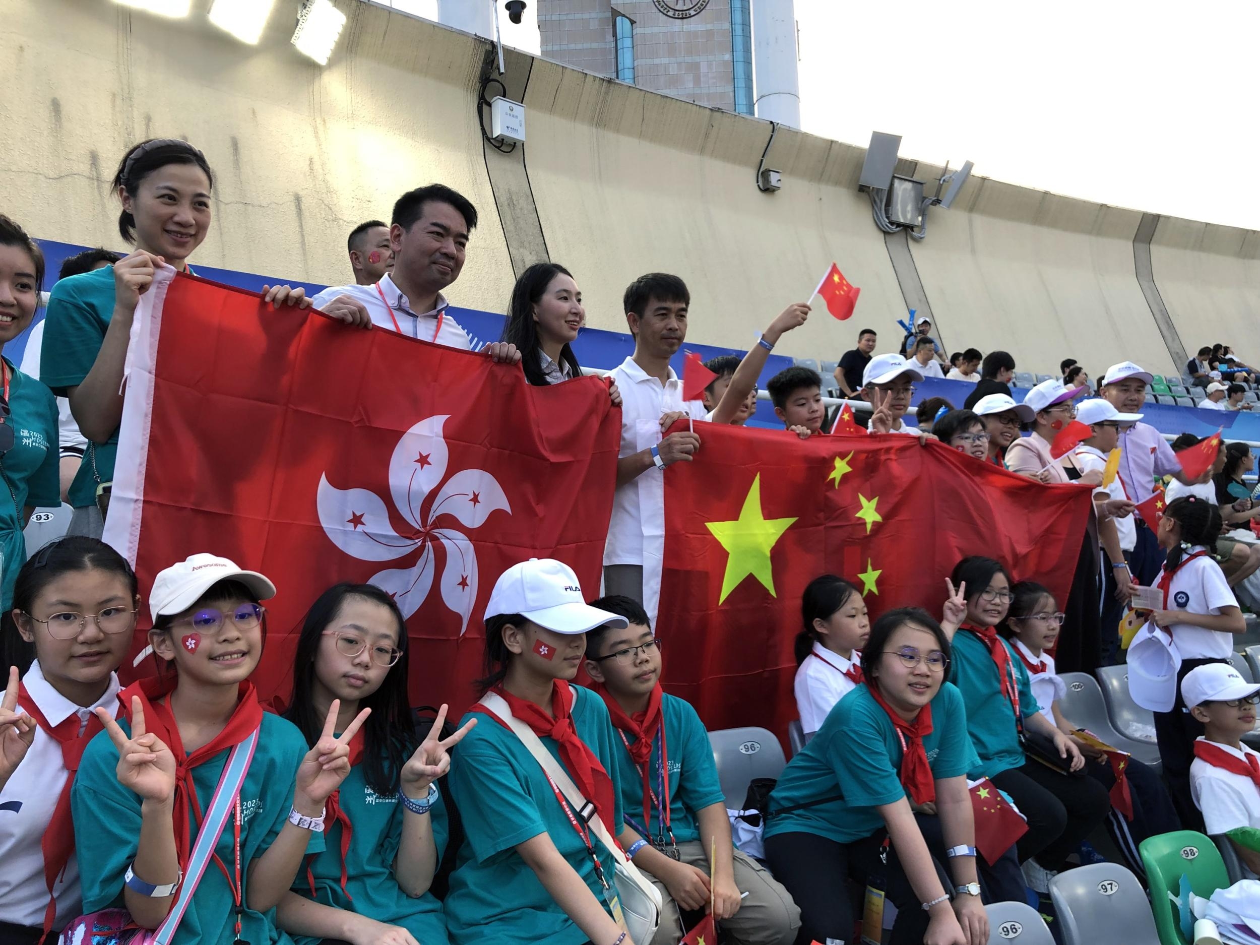 比赛现场,温州市中通实验学校18名孩子和香港马鞍山灵粮小学18名孩子结对而坐,手中挥舞着国旗和助威棒,一起为中国香港队加油。“我们今天早上从香港直飞温州,下飞机后先到中通实验学校进行参观,然后一起过来看比赛了。”香港马鞍山灵粮小学副校长袁见明告诉记者,结对的孩子第一次见面原本还有些害羞,但在观看比赛中,为同一支球队加油后,孩子们很快就熟络了起来。