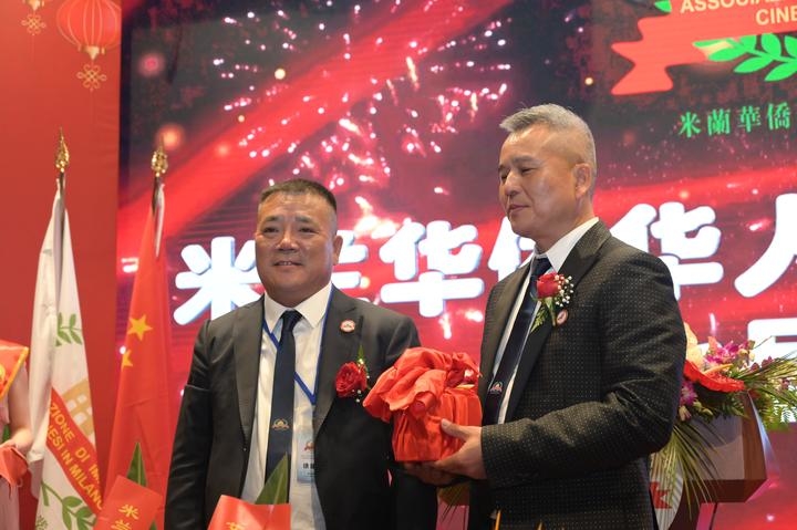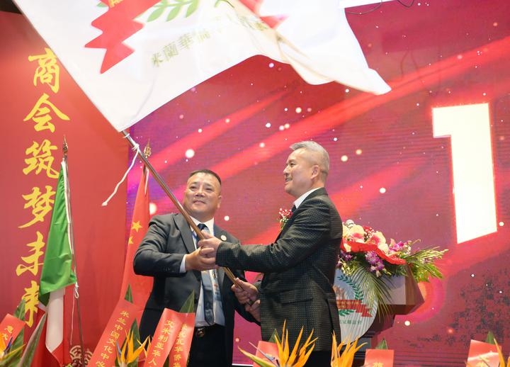 在全场热烈的掌声中,米兰华侨华人企业家联谊会第六届会长徐建平与第七届会长陈金隆进行了交接会旗、会印的仪式。