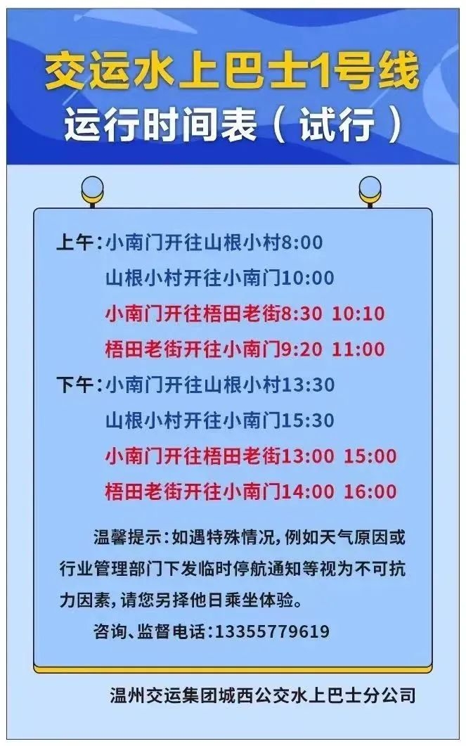 近日,温州交运水上巴士一号线全线贯通,运营航线从此前的印象南塘码头延展至山根音乐艺术小村,为市民朋友带来“水韵瓯越 悠游塘河”的出行体验。