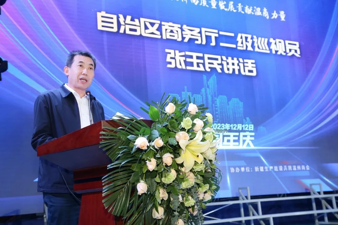 自治区商务厅二级巡视员张玉民在讲话中表示,2023年里,新疆温州商会在加强组织建设、开展交流合作、投资引资、服务企业、参与公益事业等方面做了大量具体而富有成效的工作。希望商会充分发挥好桥梁和纽带作用,为加强新疆与温州的交流与合作多做工作,带动更多企业支持和参与新疆发展,为新疆经济社会高质量发展作出更多商会贡献;温州商会民营企业要牢牢把握发展机遇,增强发展信心,积极参与自贸试验区建设,进一步发展企业、成就更大事业。