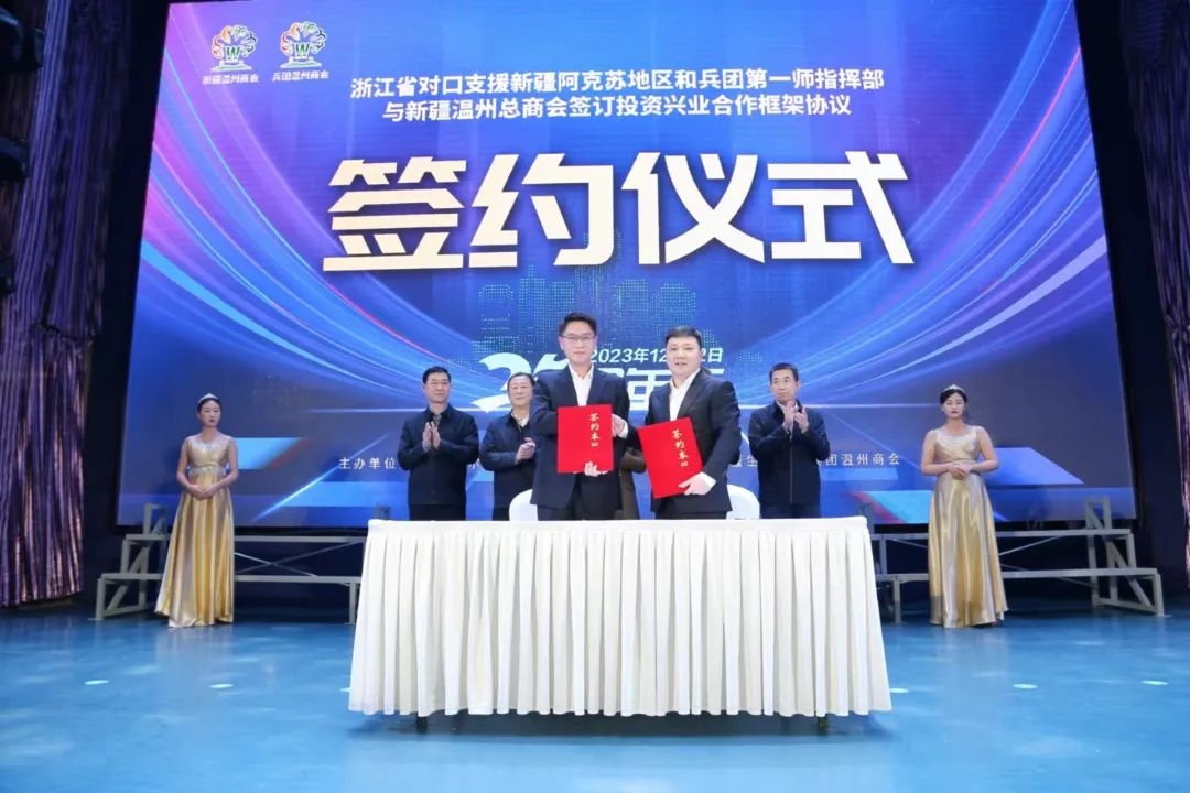浙江省对口支援新疆阿克苏地区和兵团第一师指挥部与新疆温州总商会签订了投资兴业合作框架协议。