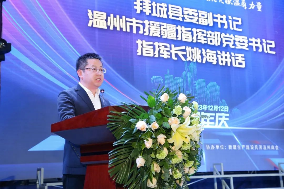 拜城县委副书记、温州市援疆指挥部党委书记、指挥长姚海在讲话中对新疆温州总商会的建设成绩给予了高度评价。他希望新疆温州商会能够始终把服务好温商作为工作的出发点和落脚点,积极帮助会员企业开拓市场、解决难题、维护权益,使商会真正成为在疆温商的温馨港湾;广大温商企业勇于创新、开拓进取,全力把企业做大、做强、做长久;情系家乡、情暖天山,全力推动温商温企温资参与援疆事业,促进两地经济互动发展、融合发展。