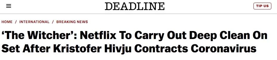 在海维尤公开自己的病况后,deadline曝出Netflix在给《猎魔人》剧组发停工邮件后又追加了一封邮件,透露在做出停拍决定后,发现该剧制作相关有一个人感染了新冠病毒,正在寻求医疗救治。而Netflix称将马上关闭伦敦的片场,进行深度清洁和消毒,也正在与这名感染者进行过密切接触的人联系,建议剧组其他人员自我隔离观察14天。