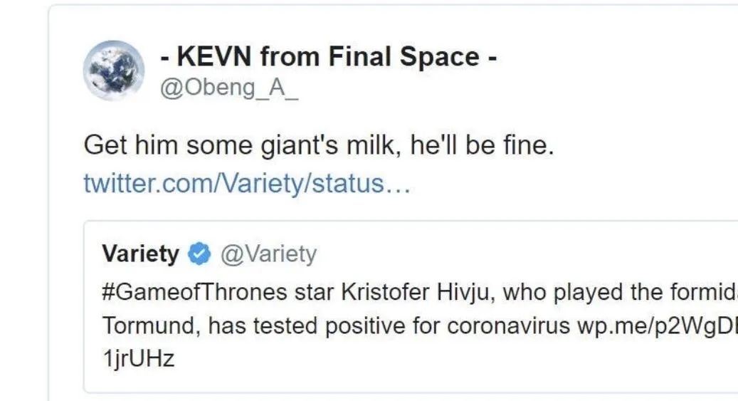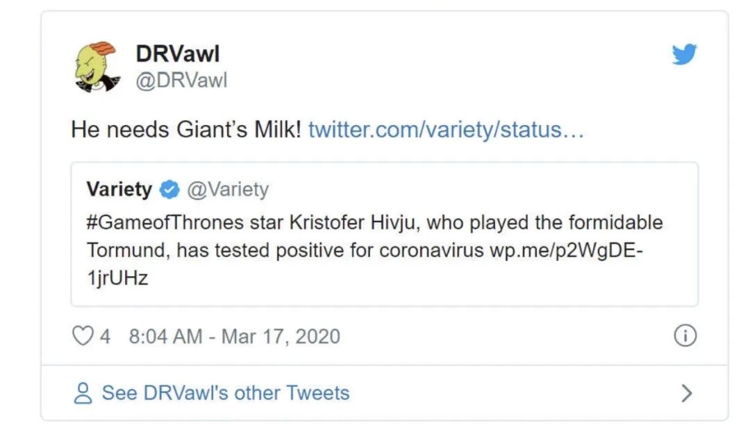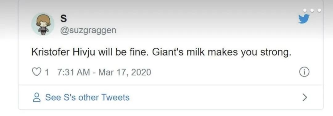除了担心和祝好,还有不少"入戏太深"的权游迷们都希望他赶紧喝巨人奶,这样才能好得快,更强壮......