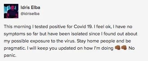 此外,在同一天,曾出演《速度与激情:特别行动》《雷神》系列的伊德瑞斯·艾尔巴(Idris Elba)也在社交媒体上透露自己新冠病毒检测呈阳性。