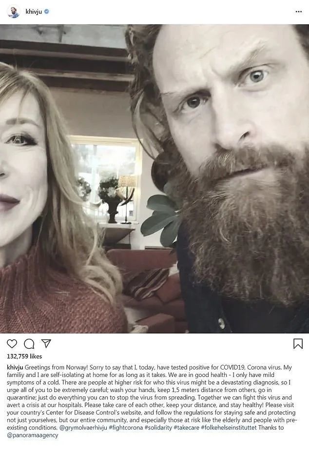 《权力的游戏》中“巨人克星托蒙德”的扮演者、挪威男星克里斯托弗·海维尤(Kristofer Hivju)在ins上发出一张自己与妻子(Gry Molvaer Hivju)的合影,并透露自己新冠肺炎病毒检测呈阳性,目前正在家中隔离。