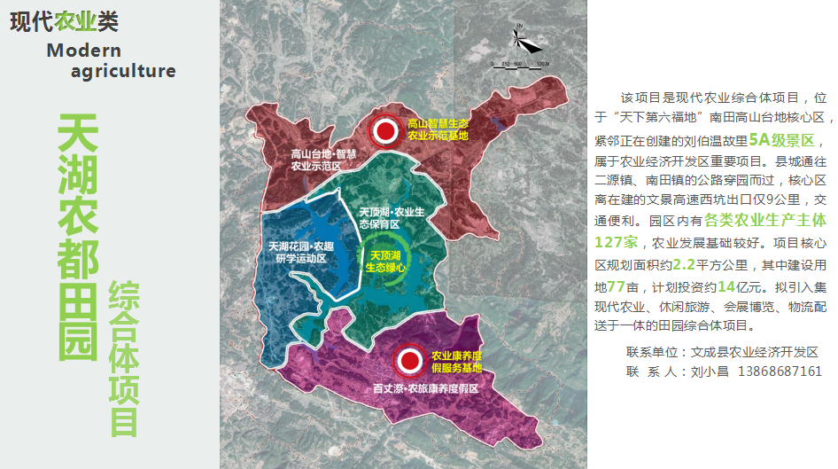 该项目是现代农业综合体项目,位于“天下第六福地”南田高山台地核心区,紧邻正在创建的刘伯温故里5A级景区,属于农业经济开发区重要项目。县城通往二源镇、南田镇的公路穿园而过,核心区离在建的文景高速西坑出口仅9公里,交通便利。园区内有各类农业生产主体127家,农业发展基础较好。项目核心区规划面积约2.2平方公里,其中建设用地77亩,计划投资约14亿元。拟引入集现代农业、休闲旅游、会展博览、物流配送于一体的田园综合体项目。