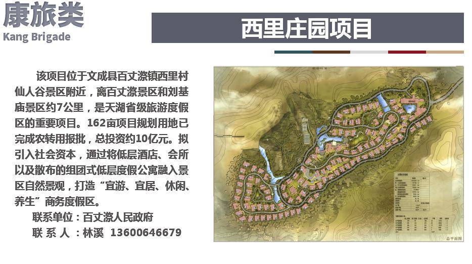 该项目属于康旅类项目,位于百丈漈镇西里村仙人谷景区边上,离百丈漈景区和刘基庙景区约7公里,是天湖省级旅游度假区的重要项目。162亩项目规划用地已完成农转用报批,总投资约10亿元。拟引入社会资本,通过将低层酒店、会所以及散布的组团式低层度假公寓融入景区自然景观,打造“宜游、宜居、休闲、养生”商务度假区。