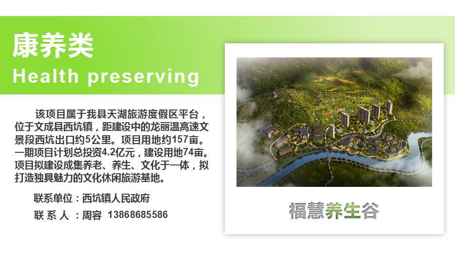 此次,文成总共带了5个项目,康旅、康养、商服、先进制造业、现代农业5个板块各一个,涉及森林氧吧小镇、天湖旅游度假区、生态产业园、农业经济开发区4个产业平台。