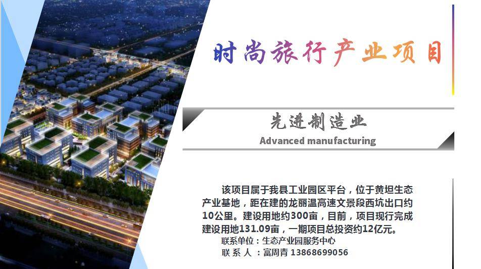 该项目属于先进制造业项目,位于黄坦生态产业基地,是文成县生态产业园核心项目,离G322国道仅2公里,离在建的文景高速西坑出口约10公里,交通便利。黄坦生态产业基地可开发利用空间达2000多亩,一期项目建设用地约300亩,总投资约12亿元。拟引入集产品研发、生产加工、展示交易、物流配送等功能于一体的时尚旅行产品制造项目。