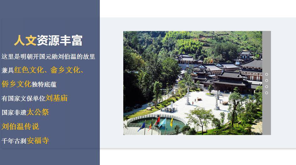 明朝开国元勋刘伯温的故里,兼具红色文化、畲乡文化、侨乡文化独特底蕴,有国家文保单位刘基庙、国家非遗太公祭和刘伯温传说、千年古刹安福寺,是浙江省革命老根据地县,也是浙江省两个重点侨乡县之一,全县41万人中有16.8万人侨居在世界70个国家和地区。