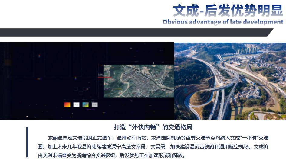 近年来,文成县依托生态资源、旅游资源、侨商资源三大优势,加快推进综合交通、生态产业、城镇开发、生态文明、公共服务等“五大百亿工程”建设,后发优势得到有效发挥,去年GDP增速达到9.1%。尤其是随着龙丽温高速文瑞段的正式通车,温州动车南站、龙湾国际机场等重要交通节点均纳入文成“一小时”交通圈,加上未来几年,文成将陆续建成溧宁高速文泰段、文景段,加快建设温武吉铁路和通用航空机场,文成将由交通末端蝶变为浙南综合交通枢纽,后发优势正在加速形成和释放。