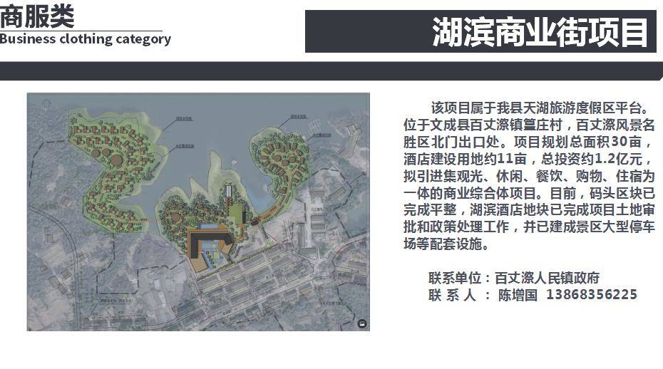 该项目属于商服类项目,位于百丈漈镇篁庄村,就在百丈漈风景名胜区北门出口处,也是天湖省级旅游度假区的重要项目。项目规划总面积30亩,酒店建设用地约11亩,总投资约1.2亿元,拟引进集观光、休闲、餐饮、购物、住宿于一体的商业综合体项目。目前,码头区块已完成平整,湖滨酒店地块已完成项目土地审批和政策处理,并已建成景区大型停车场等配套设施。