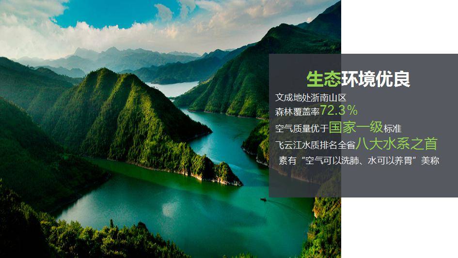 文成地处浙南山区,森林覆盖率72.3%,空气质量优于国家一级标准,飞云江水质排名全省八大水系之首,素有“空气可以洗肺、水可以养胃”的美称,先后获评中国长寿之乡、国家生态县、中国气候养生福地等荣誉称号。