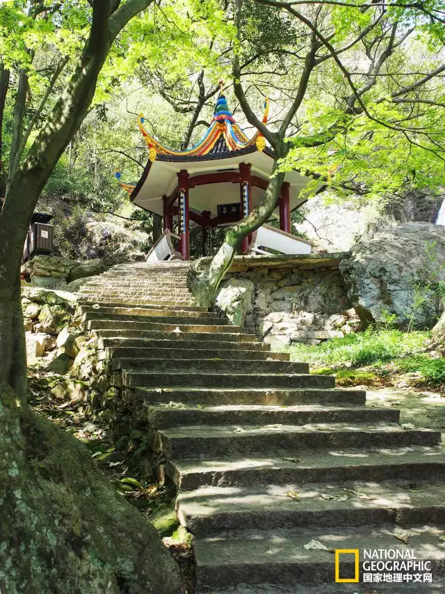 这隐藏在石阶上方的,是梅雨亭。廊柱上的楹联是这样的:梅潭终古夏如秋,飞瀑半天晴亦雨。