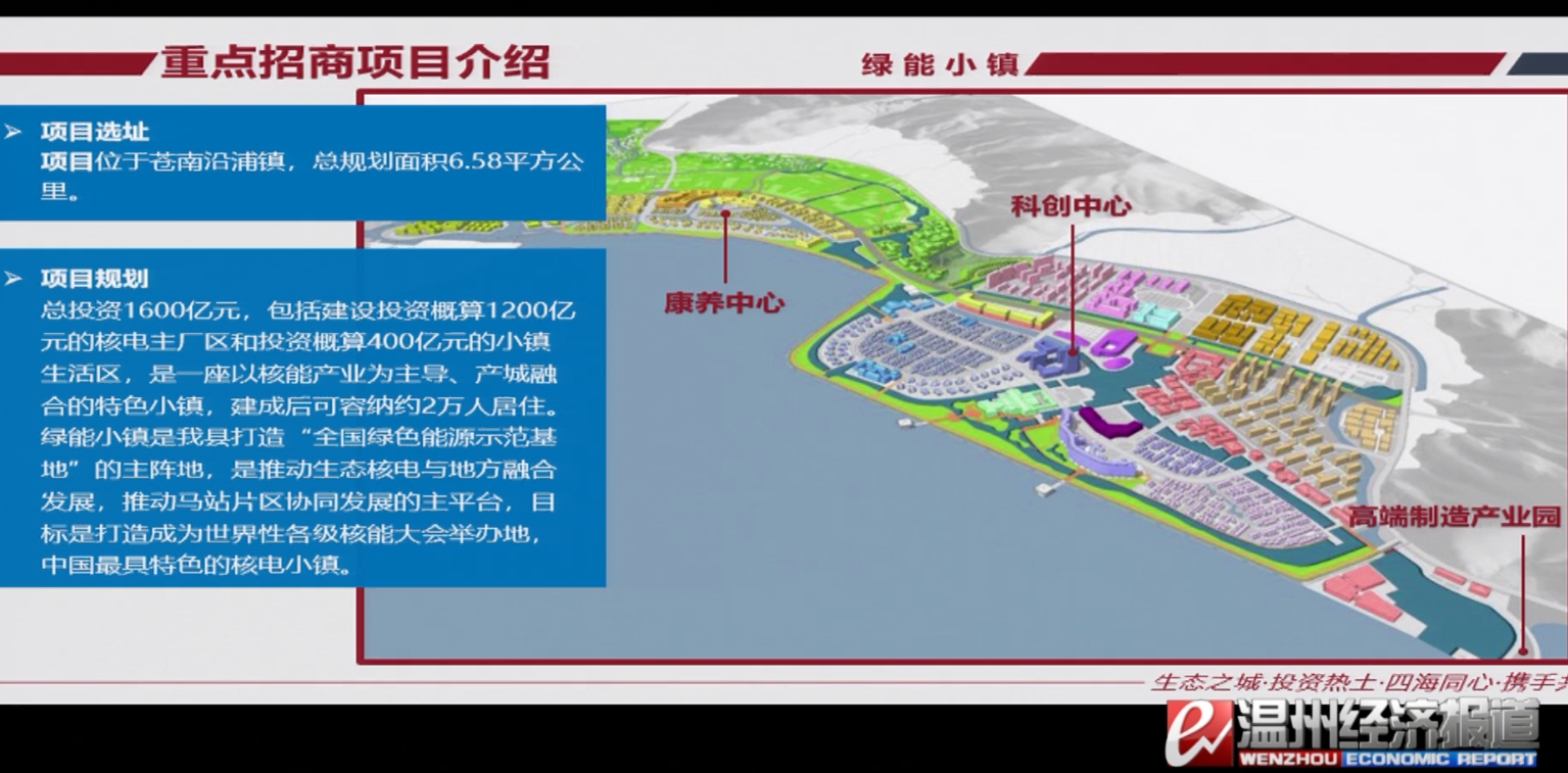苍南县重点推出了总投资1600亿元的绿色小镇项目,绿能小镇是苍南打造“全国绿色能源示范基地”的主阵地,将打造成为世界性各级核能大会举办地、中国最具特色的核电小镇。