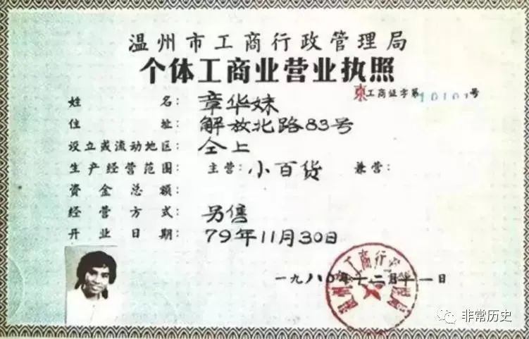 1980年12月11日,章华妹从当时的温州市工商局领到了编号为10101的营业执照。营业执照上的住址,写的是解放北路83号。