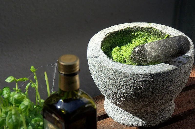 意大利Pesto酱,用罗勒、橄榄油和松子研磨而成,可以和意大利面食或其他菜肴如汤一起食用。