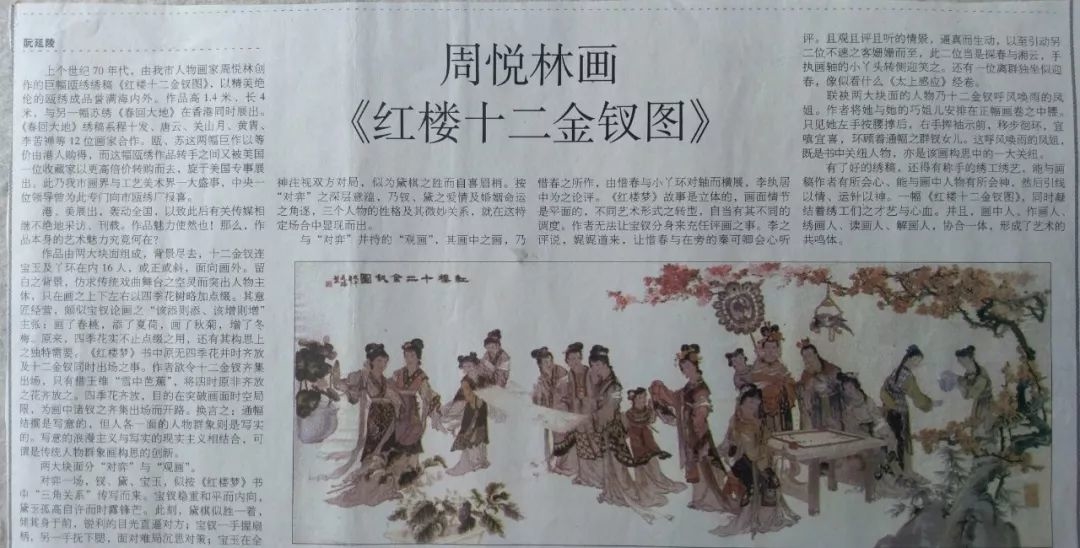 周悦林最早的作品是连环画,也有几幅宣传画,在上世纪50年代初期发表于《中国少年报》、《妇婴卫生》杂志等报刊。周悦林为报纸画连环画有不菲的收入,但没有工作在那个年代总让人觉得游手好闲,因为要照顾母亲又无法去外地闯荡,于是他就加入了瓯绣厂,为瓯绣画图纸。以周悦林的水平却屈居在瓯绣厂做画师实在有些大材小用,但当时瓯绣厂为周悦林的妻子解决了温州的工作,结束了夫妻两人多年来两地分居的生活,让他十分感激。说起姐夫的人品,小舅子柯林圭对周悦林赞不绝口。上世纪60年代,他还带着周悦林的几幅工笔人物画,到杭州西泠印社请店老板品评。老板细加观赏后,当即表示,全部都要。好多年过去,当柯林圭再去西湖的时候,看到西泠印社还张挂着周悦林的画作。岁月流逝,周悦林在瓯绣厂风平浪静地过了十年,正当他得心应手之时,“文革”开始了。各单位纷纷成立形形色色的战斗队,瓯绣厂也不例外。那时候外贸订单受到影响,周悦林就在那段时间潜心作画,他在瓯绣厂主要画人物画。1979年初,长期与温州瓯绣厂保持业务往来的中国丝绸外贸公司下派任务,决定在香港举办一场展览会,聘请国内几大名绣单位各自出示精品参展。周悦林与公司领导商议之后,公司意见:最好在一幅图上展现红楼十二金钗的人物,以此代表《红楼梦》主题。回去以后,周悦林呕心沥血奋斗了整整四十二天,画完了这副原本需要3~4个月才能完成的大型作品,绣工加班加点在展会开始前夕顺利完成。由于时间太紧,在印发的展览作品目录上,这副《红楼十二金钗图》也来不及登出。