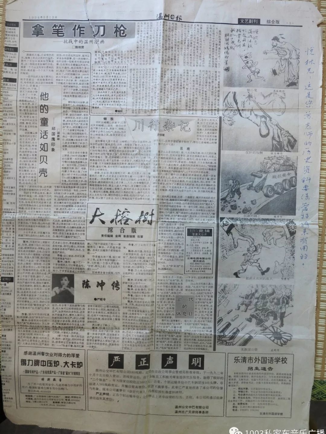 苏昧朔先生为抗日所作的连环画(热心人士特意将这张报纸寄给周悦林,并在报纸上手写了一句话:悦林兄,这是您苏老师的历史资料,要保管好将来有用的。)