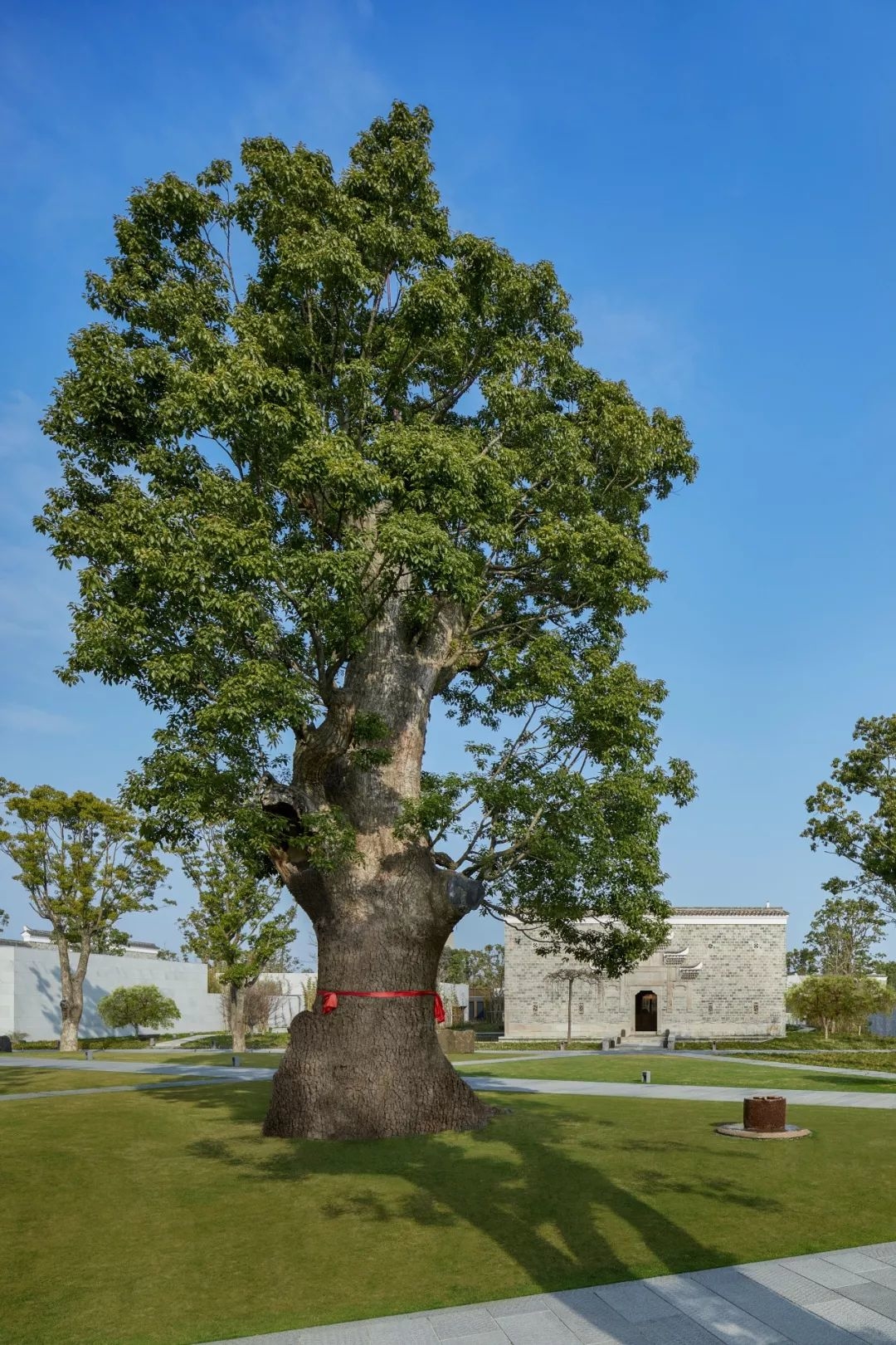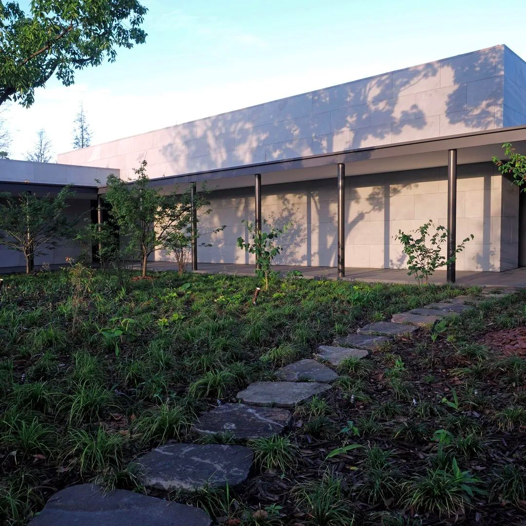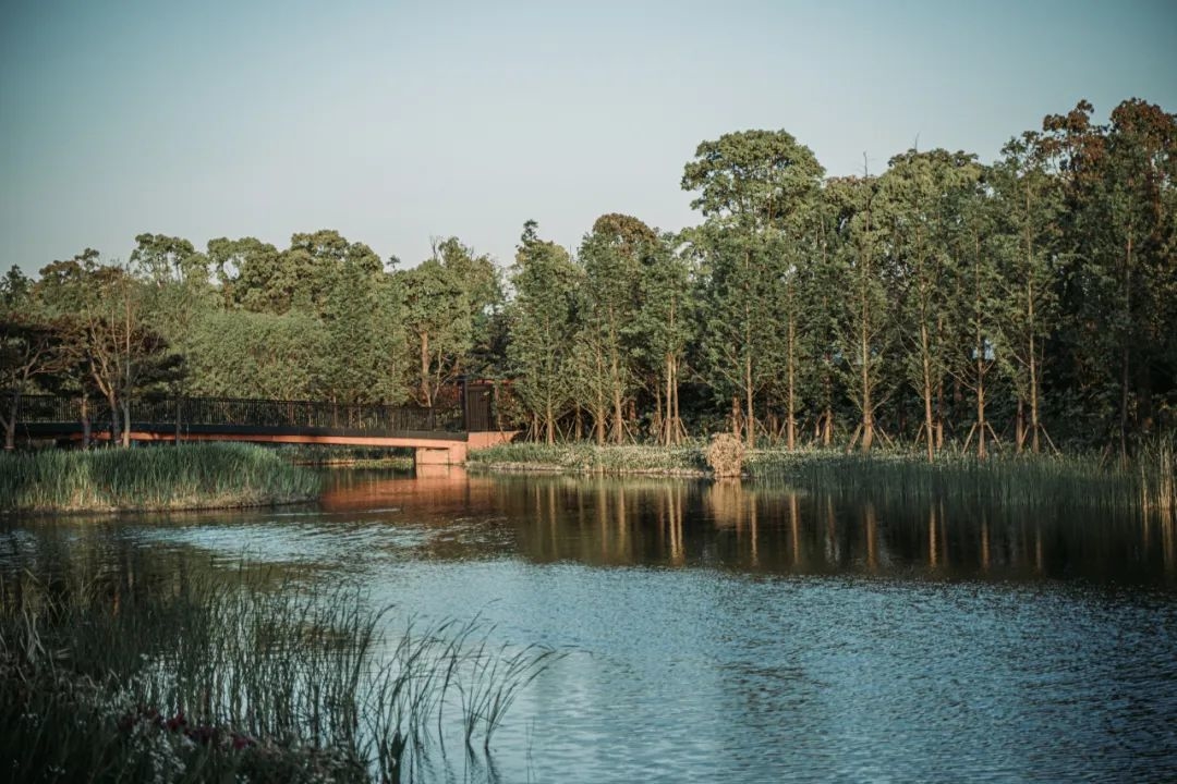地面上全部种植了来自中国本土的植物,如睡莲、荷花等,与香樟大树相辉映。