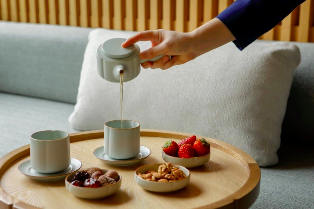 客房的洗浴空间用过晚餐后,散步回到房中,管家会贴心地送来了夜间点心和一枚精致的金丝楠木书签,嗅一下,清香四溢。