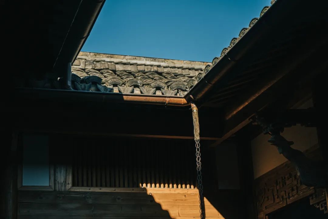 比如院里悬挂着的铁链,在下雨天能看见雨水顺至而下,不仅充满着诗意和美感,还避免院落内积水。