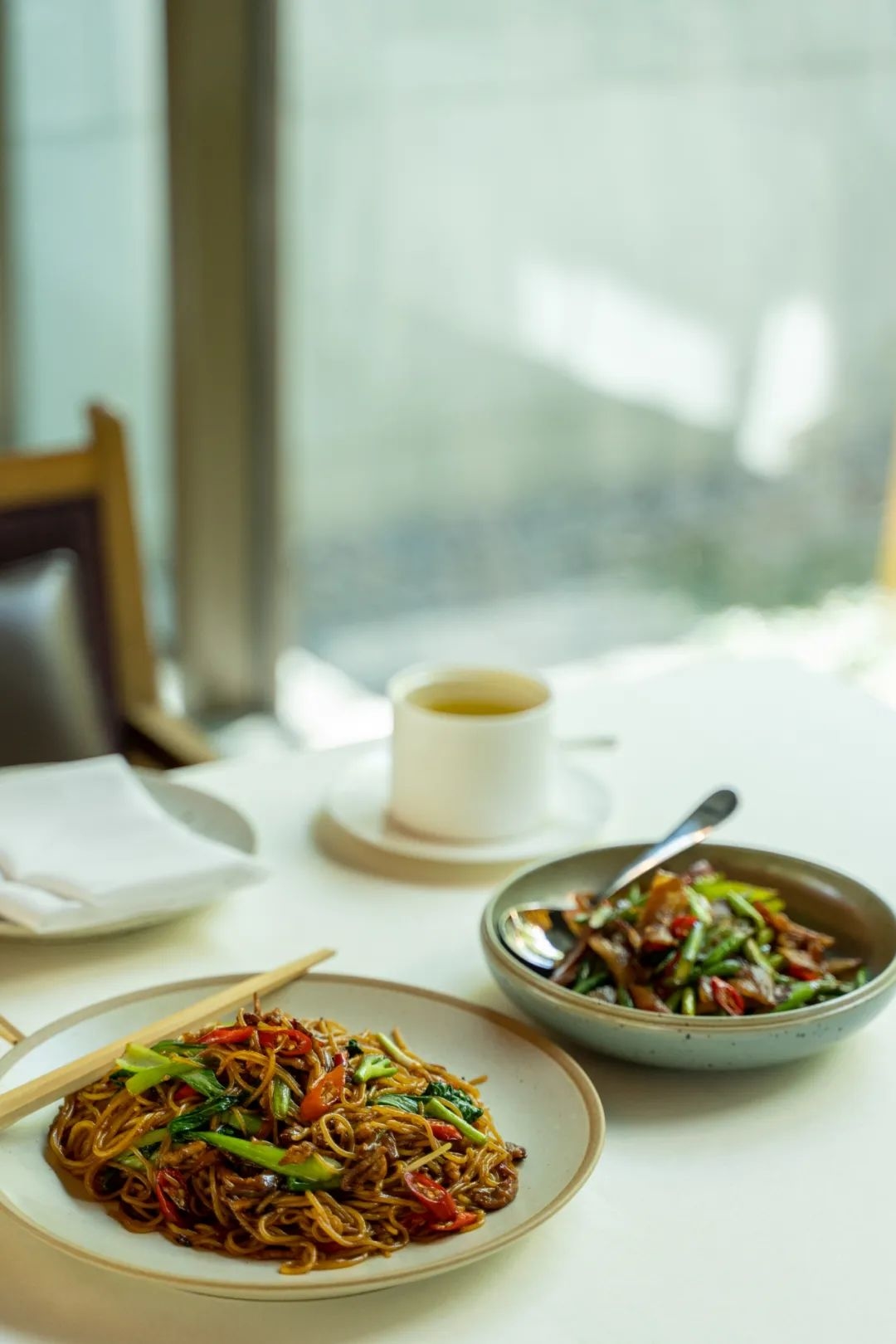 阳光从木质的花格窗透过,光影舞动,树叶、器皿穿插在空间里,充满着东方韵味。
