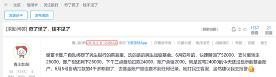 两个月后,网友“轻重不分”发帖表示“仅开民生银行卡三天,就遇到民生薪盈宝又一次出现了扣款不见的问题。”