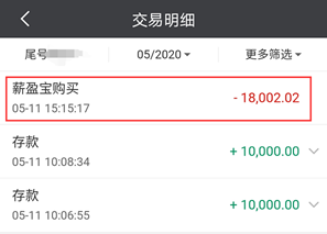 作为一个主要精力在写基金及理财的记者,基金君至少要体验10个渠道的基金申赎及理财业务。5月12日,基金君准备在民生银行申购一款理财产品,打开民生银行手机银行APP被吓一跳,前一日准备好的2万元变成2千元,账户余额直接少了一个0,资金瞬间“损失”90%,基金君懵圈后赶紧查看交易明细,发现一笔“薪盈宝购买”的交易记录。