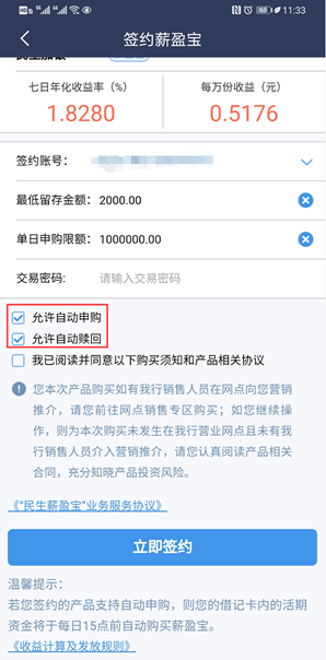第二,前浪梦寐以求的选择权利,民生银行的后浪客户并未享受到。截至发稿,薪盈宝对接四只货币基金,签约只要选定其中任何一只就行。选定一只货基后进入签约流程页面,需要勾选三个选项,其中,“允许自动申购”、“允许自动赎回”被默认勾选,不可取消。默认勾选已被广大网友诟病。