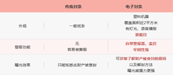 以往法院查封标的物使用的“封条”均为条状纸质的条子,存在财产“查而不封”的问题。相比传统的纸质封条,电子封条不仅在外观上比较结实,功能方面也是较纸质封条更完善,优势明显。