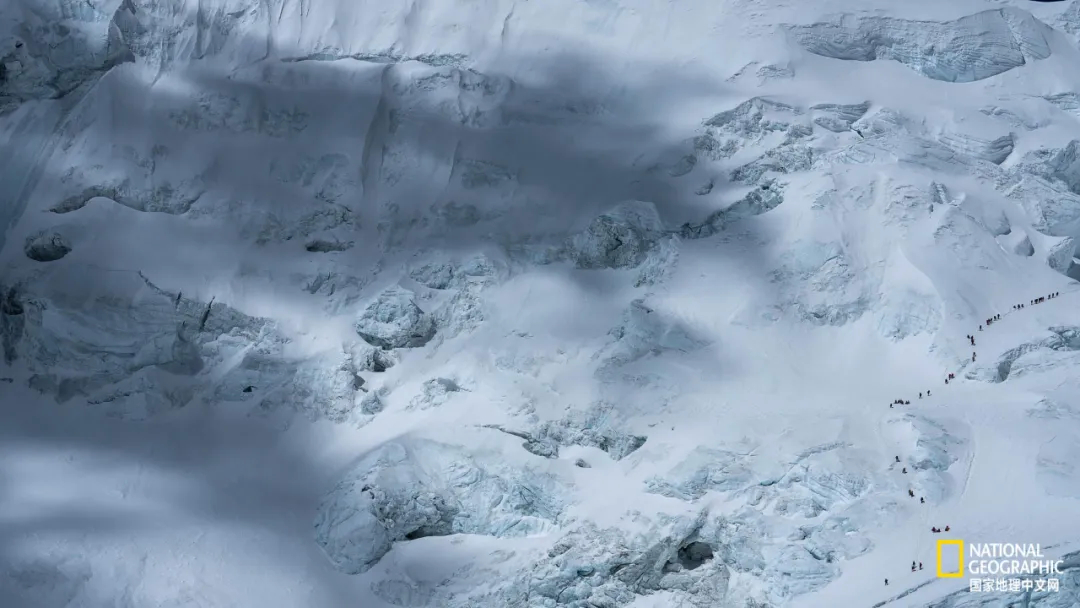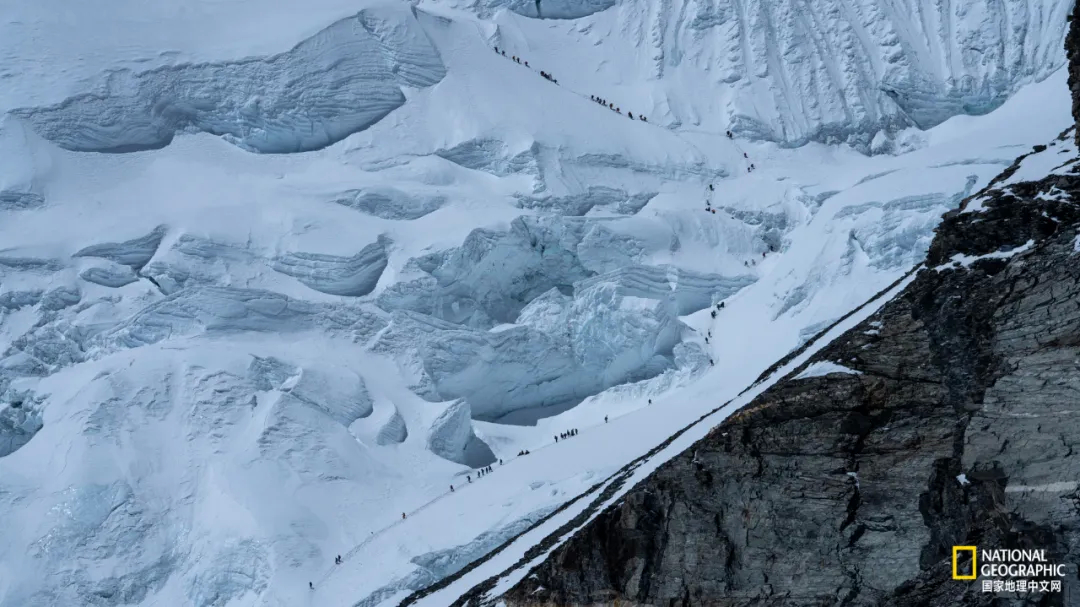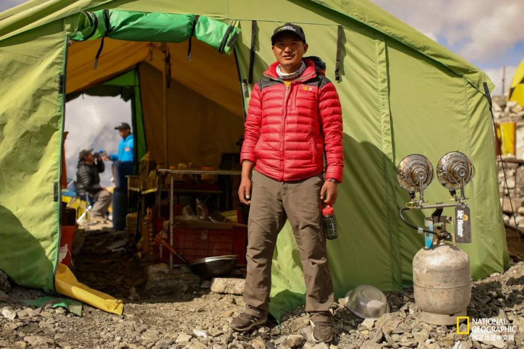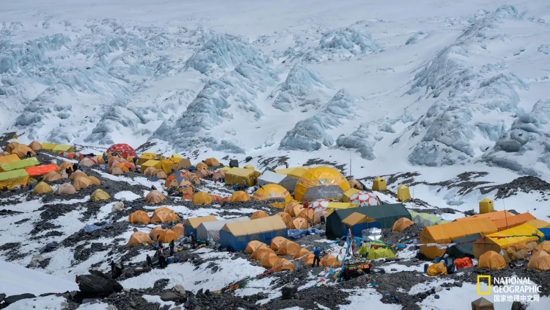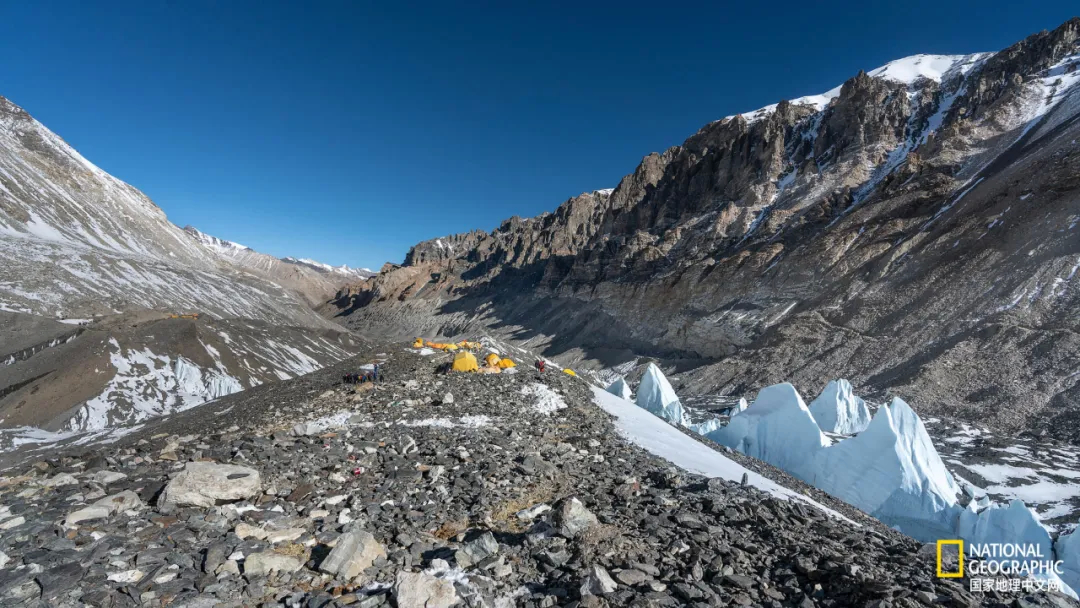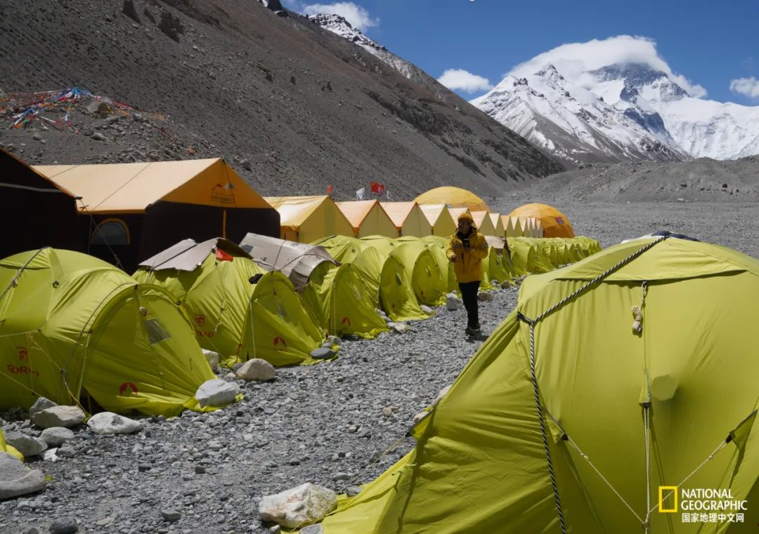 5月6日登山测量队从海拔5300米的大本营出发,前往5800米的过度营地,他们从这里一步步开始测量工作。