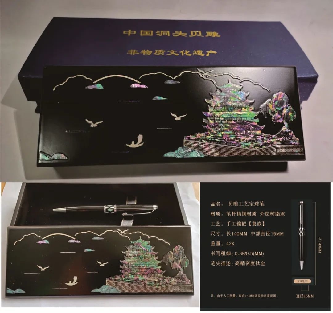 螺钿笔是以最具有洞头地理标志的望海楼为主题,线条精细,层次分明,楼台小阁、青石琉瓦活灵活现,再现了“气吞吴越三千里,名贯东南第一楼”的气势。