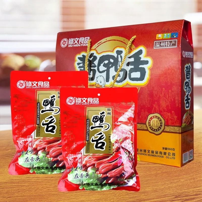 温州鸭舌是一道温州著名的地方小吃,鸭舌是卤的,风至半干,韧性十足,采用现代化工艺将鸭舌独立分装,保留鸭舌原有风味。