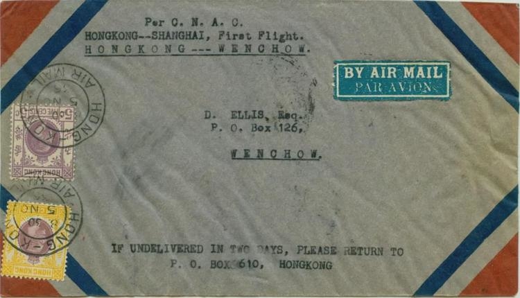 图为香港至温州首航封。信封左上注明“Per C. N. A. C. HONGKONG--SHANGHAI,First Flight. HONGKONG---WENCHOW.”(意:经中国航空公司香港—上海的首次航班,香港—温州)。信封销有“36年11月5日8:30分 香港航空邮件”邮戳,寄抵温州时间为11月6日15时(封背有温州的到达戳)。