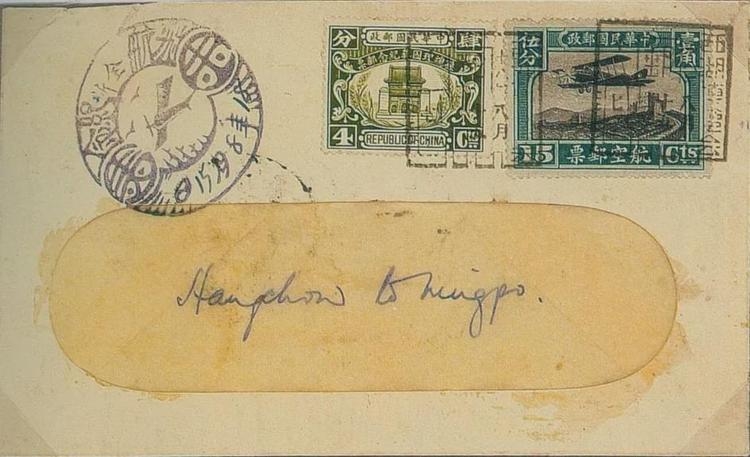 利用广州至上海返程的首次航班,由温州寄往上海的首航封,贴两枚15分的三版航空邮票,销“沪粤航空邮运开航纪念,廿二年十月廿六日,永嘉(温州)”的纪念邮戳。由于受大风暴的影响,邮件于10月27日到达上海(封背有上海到达戳)。