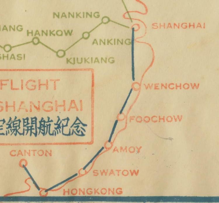 “沪粤”线开通时制作的首航封上的航线图,从中可以看出航线的规划还有香港一站,而实际上当时并未飞达香港。直至1936年11月,沪粤线始在香港增设了航空点。