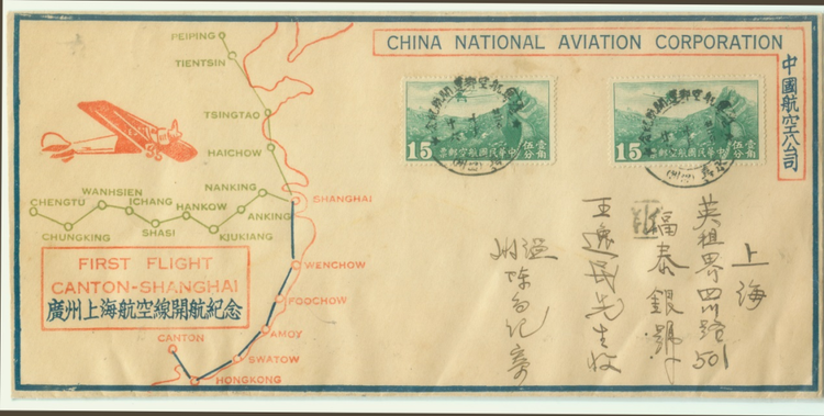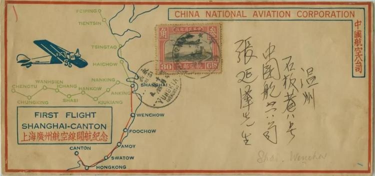 由此航班携带的上海至温州的首航封,收信为:温州石板巷八号 中国航空公司 张延泽先生。信封盖有“沪粤航空邮运开航廿二年十月廿四 上海”纪念邮戳,并有“永嘉(温州) 廿二年十月廿四 九时”到达日戳。