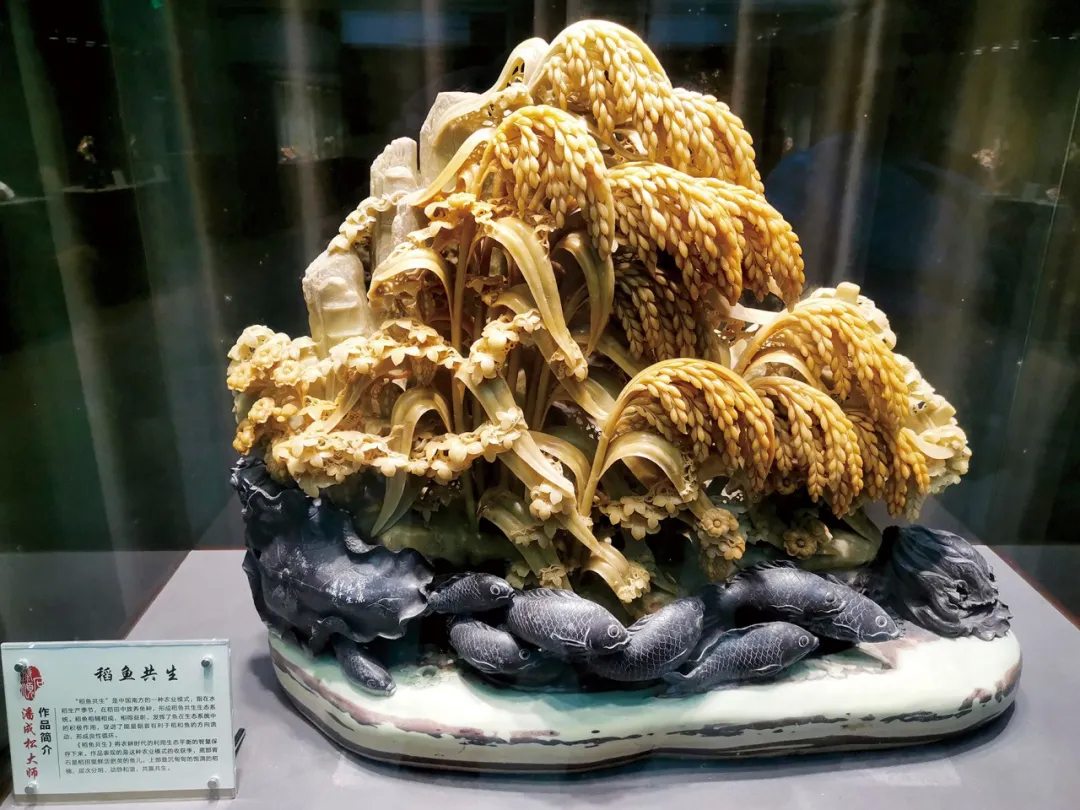 传统的石雕,主石与底座是分开的,但潘成松的印度石雕《稻鱼共生》,却是一件连体配座法的作品。主石是金灿灿的稻穗,底座是游弋的田鱼,上下呼应,“稻”“鱼”共生。他的同一题材的泰顺石雕作品则为中国农业博物馆所收藏。近日,潘成松的新作泰顺石雕《观山海》,以树根为座,与石雕中的松枝树条浑然一体,妙趣横生。此外留硬雕法(如《豆芽》)、留纹雕法(如《少女》)等创新的技法,在潘成松的石雕作品中也都屡见不鲜。