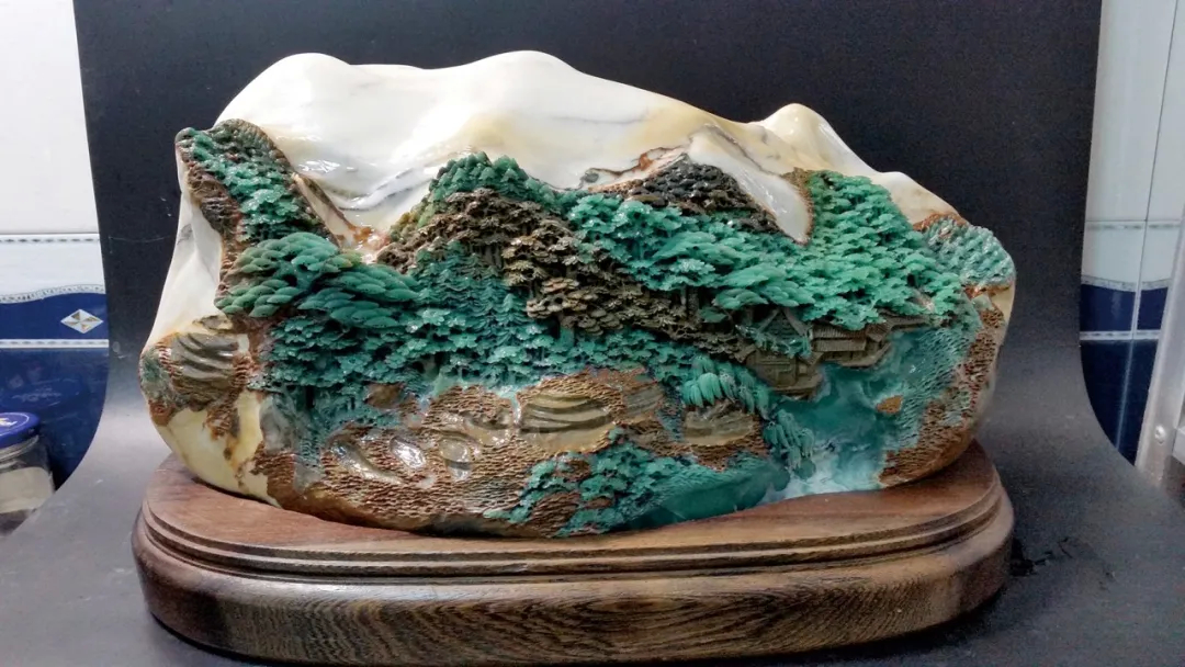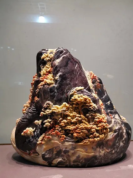 潘成松石雕作品的原料,并非单一的青田石或泰顺石,而是海纳百川,如天台石、临海石、昌化石、仙居石、云和石;福建石、寿山石、仙游石、寿宁石;贵州石、贵州鸡血石;云南石;雅安石;西安绿;印度石、南美石等,堪称彩石博览会了。