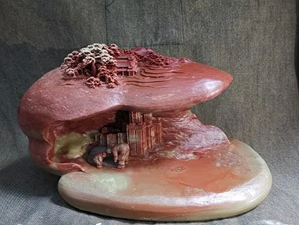 对故乡的深切眷念和挚爱,是潘成松石雕作品的一大特色,《爷爷的桃树》《一方净土》《金色廊桥》《山里山外》《归故里》等无不是作者家乡情结的物化表现。如泰顺石雕《一方净土》中的古宅,就是潘的出生之地,位于岭北偏僻的山岙里,二楼的西边间就是他童年的卧室兼“书房”。今年母亲节,潘成松祖孙三代还特意围绕《一方净土》拍了张全家福。昌化石雕《路影》,是岭北通往县城罗阳的天关古道的缩影,潘成松去县城读中学,每周都要沿着古道山路往返步行6个小时。而大片红色的昌化石,正是这条留有太多求学记忆的红枫古道的意象写照。潘成松的廊桥元素作品,都爱选用泰顺石雕琢,其蕴意不言自明。