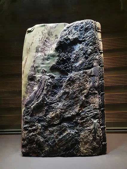 潘成松的《云深不知处》,就是一件会说话的、有石魂的作品。这是块不纯的青田封门青,粗糙的围岩杂石,穿插于油润的封门青之中,难以去“骨”留“肉”。潘成松因石施艺,只雕“骨头”不雕“肉”,将刚硬的围岩雕琢成形状各异的山峰峻岭以及依附其中的村居民宅,而柔润的封门青,则只是打磨一下,以其自身温润可人的石质玉性来表达山间的云雾,实现技法的最大减法和艺术张力上的无限放大,一润一糙,一深一浅,巧拙相生的意象造型,游目流观的空间结构,给人以强烈的视觉冲击,并产生诗意的遐想:“直入故山云”(白居易)、“惆怅故山云”(王维)、“故山云水乡”(杜牧)、“诗忆故山云”(李郢)等。这种有雕有不雕的艺术手法,与新疆玉雕大师马学武倡导的“三七律”如出一撤,天人合一,将彩石的天然之美和艺术创作之美完美地融合在一起,让作品说话,从中可以窥见作者对泰顺山乡的深切眷念。