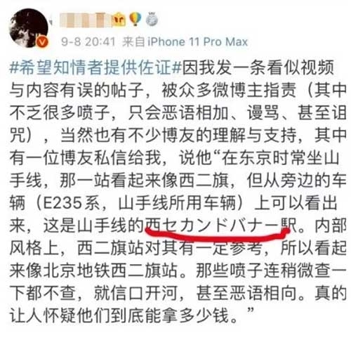 在铁证面前,博主B一开始还试图狡辩。他发文称,“现在对错都不那么重要了”,可转头又说,自己接到网友私信,称视频中的地点确确实实是山手线的“西セカンドバナー駅”,希望更多的知情者可以站出来,提供其他的佐证资料。