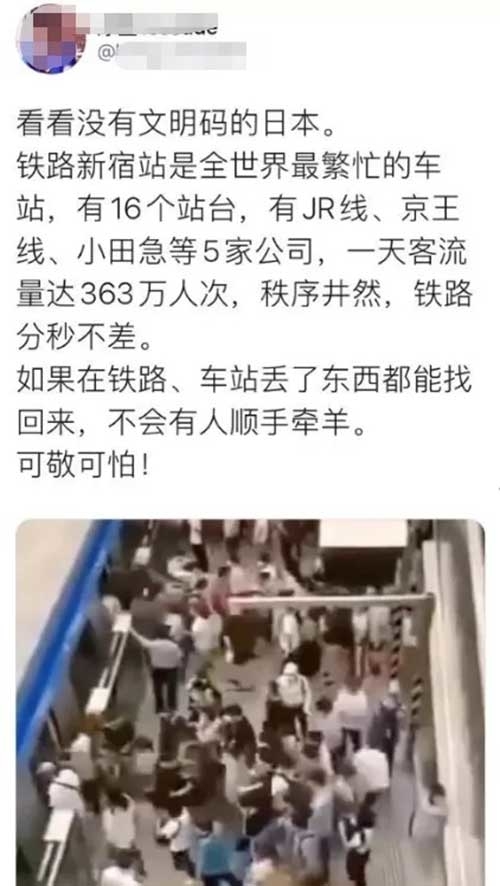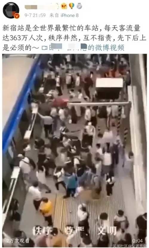 近日,微博粉丝超24万的博主A发布了一段时长仅4秒的视频,称视频里的地铁站是位于日本东京的新宿站。“新宿站是全世界最繁忙的车站,每天客流量达363万人次,秩序井然,互不指责,先下后上是必须的。”博主A写道。