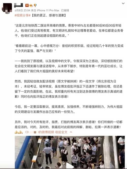 原视频的配文还写道,乘客中95%左右都是年轻人,“他/她们受过高等教育,有礼貌讲文明知书达理尊老爱幼,在单位都是业务骨干,他/她们正在挑起建设祖国的重担!”