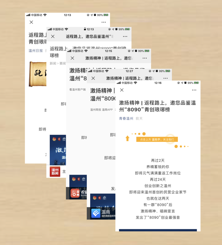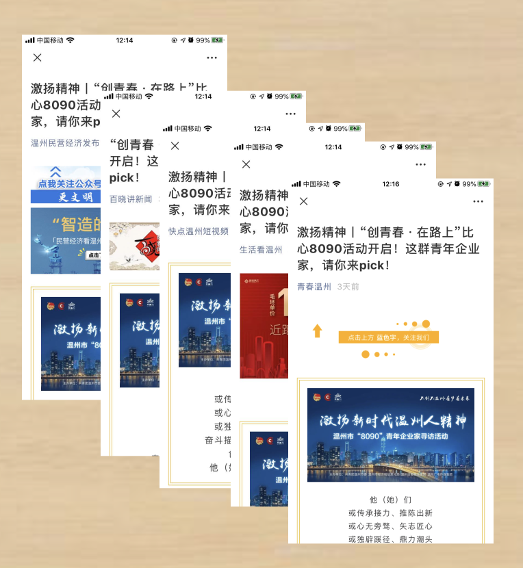 温州日报、温视经济科教频道、各微信号端、温州人客户端等推出“温州青年100”风采展示专栏,通过100秒人物视频、典型专访等形式,传播温州青年创业故事。