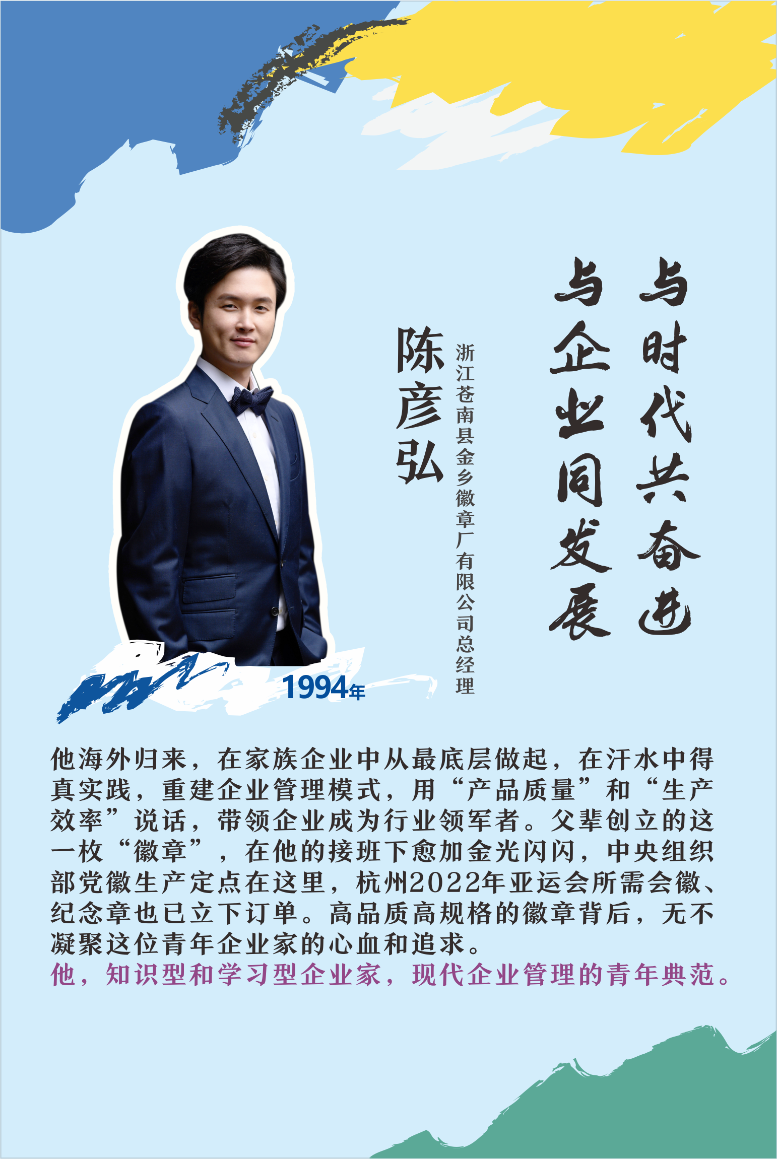 “走不寻常的路,做不寻常的事,不折不挠、追求成功。”——他就是陈彦弘。他是苍南县金乡徽章厂有限公司的接班人,也是一名普通员工;他是掌控全局的企业总经理,也是个每一道工序都能谙熟于心的技术员;他是放眼未来引领时代的创新者,也是着手当下,稳扎稳打的实干家。