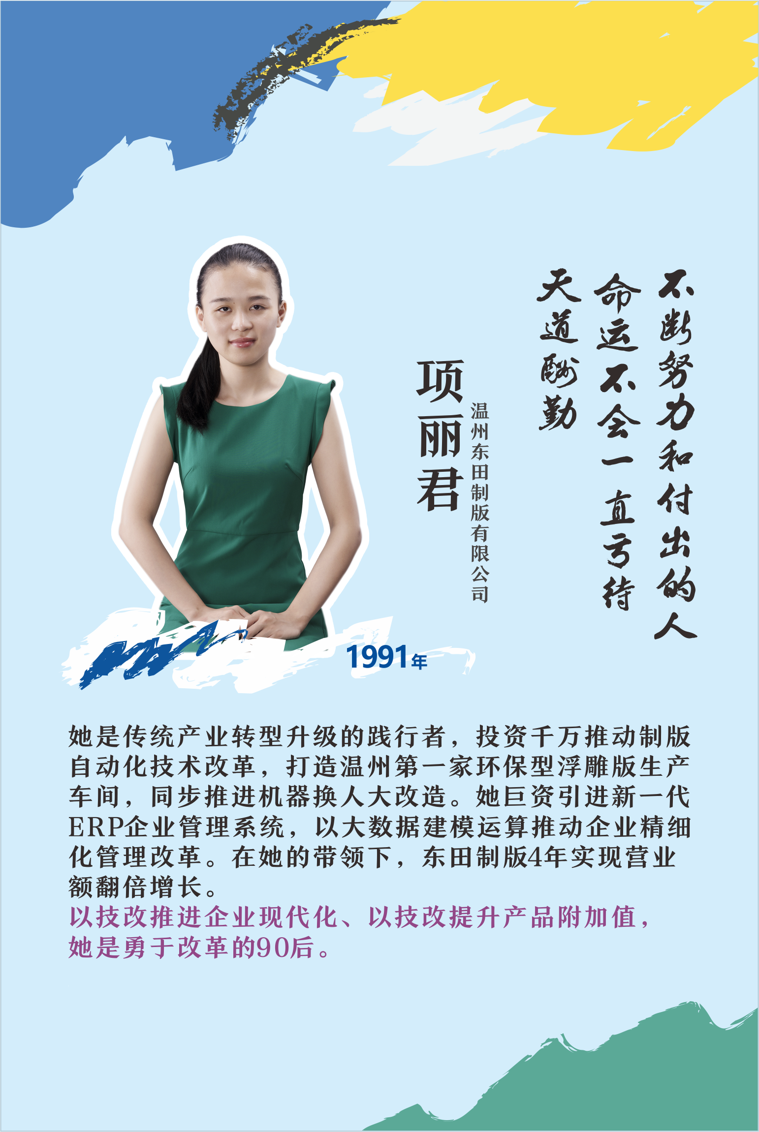 她是金融专业学霸,对各类数据敏感的她,在传统制版行业中善于利用大数据分析,找准企业存在的短板并将之补足。在企业发展过程中注重技改项目和专利研发,引领传统企业向现代化企业转型升级。
