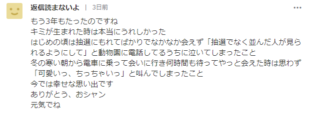 最开始只有抽签才能看到你,可我运气不好一直落选,还曾经哭着打电话给动物园说:“请不要抽签了,让排队的人也能看到吧。”在冬天寒冷的早晨坐电车去见你,等了好几个小时之后终于看到了你的样子,不由自主地叫到:“好可爱,好小啊......”